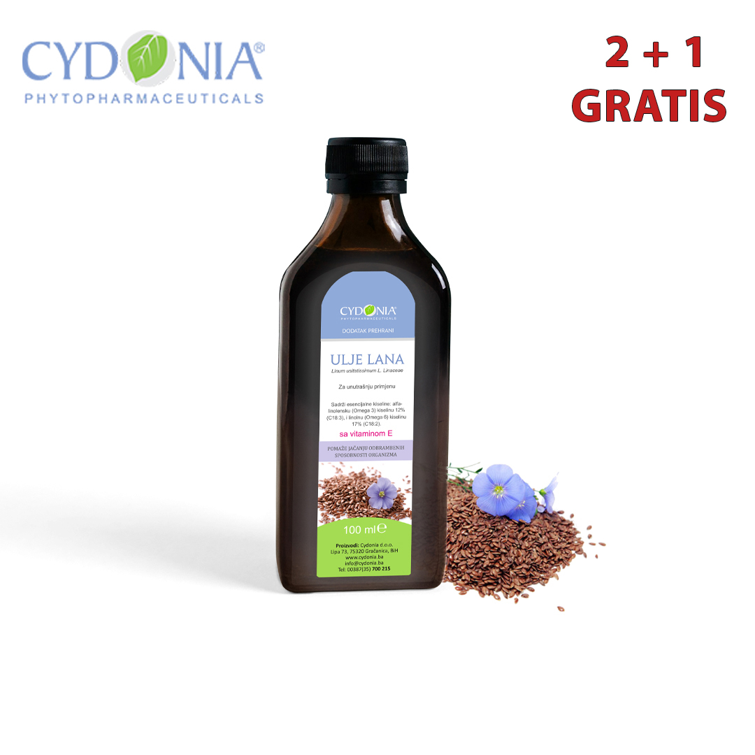 Proizvod sadrži 100 ml ulja lana, hladno prešanog (Linum usitatissimum, L.)